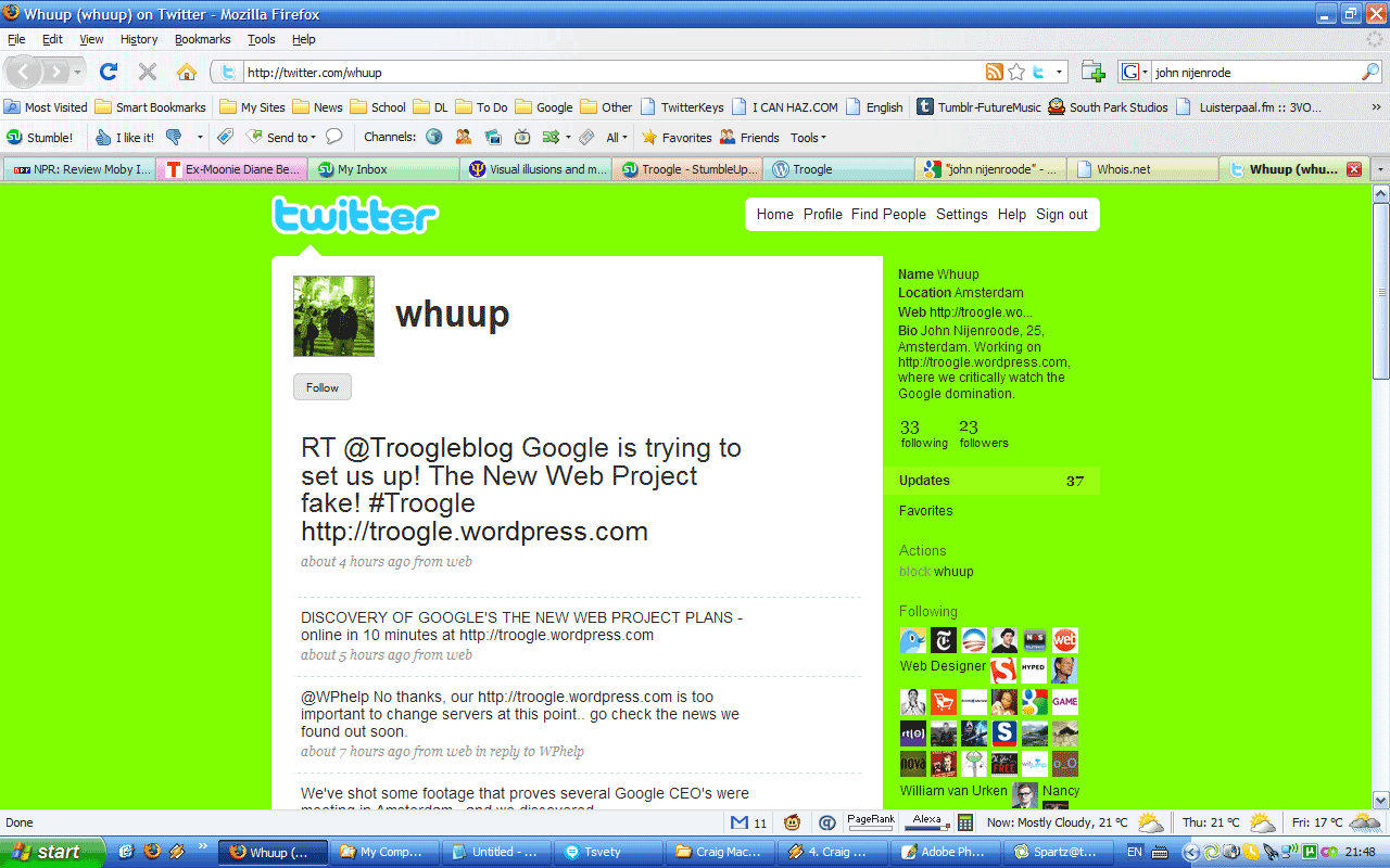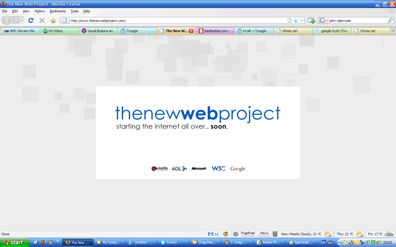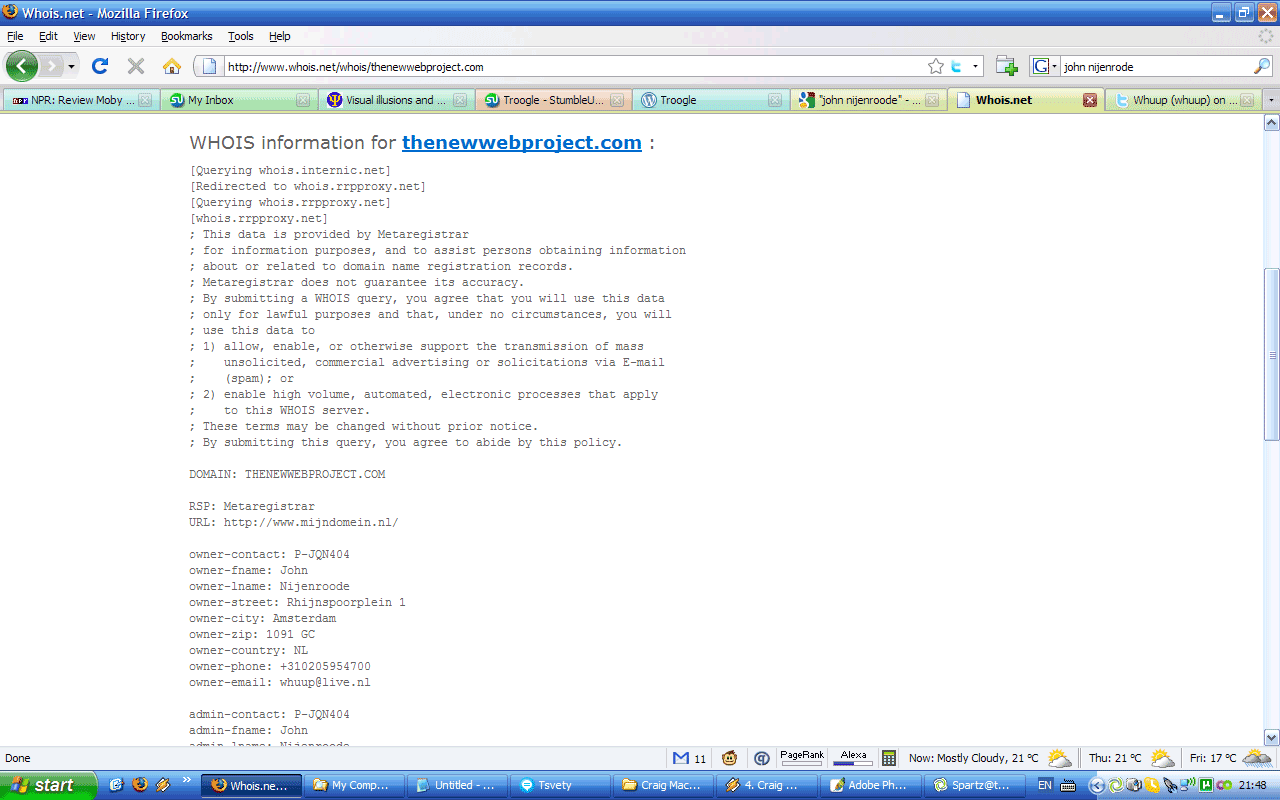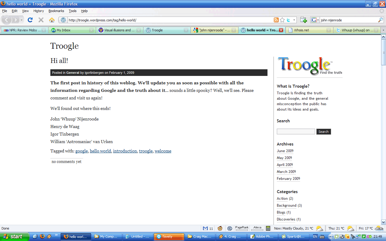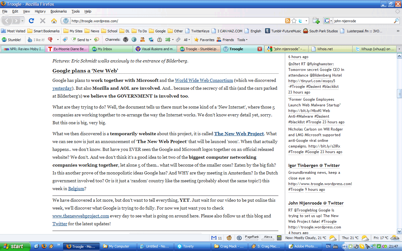 So I looked up who registered The New Web Project. A quick Whois (mirror) showed John Nijenroode. So I figured I’d check out who he is. So I ran his name through Google (ironic, I know) and found his Twitter account, even the username matches his email address. In his bio he claims to be a blogger for Troogle (mirror) and the Troogle blog says the same (mirror).